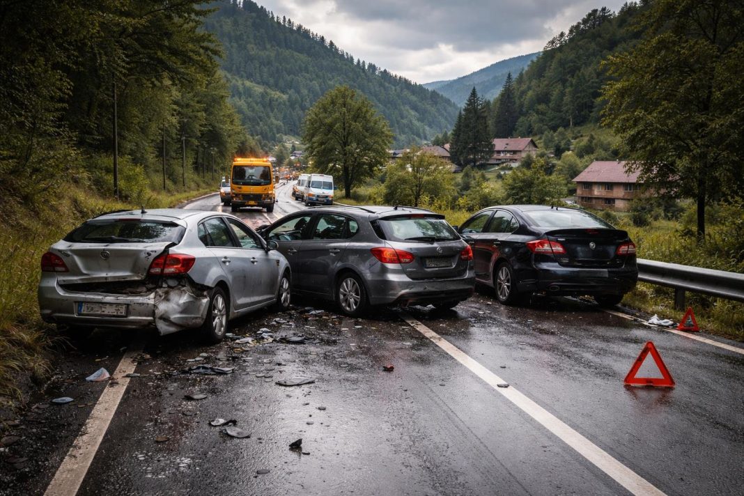 Accident în lanț pe DN67D, zona Lelești: patru mașini implicate, trei răniți transportați la spital